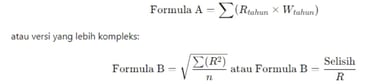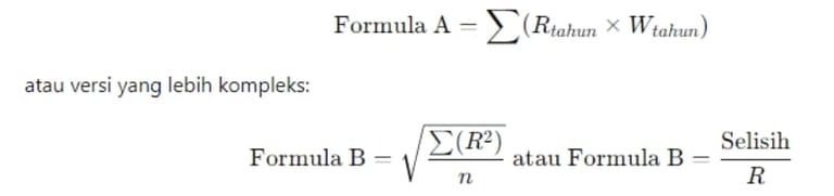Dari data seperti: Formula A = 136.694463. Formula B = 134.306221 . Kita menggunakan kombinasi rata-rata berbobot (Weighted Sum / Weighted Average) dari beberapa rasio (R) antar tahun.